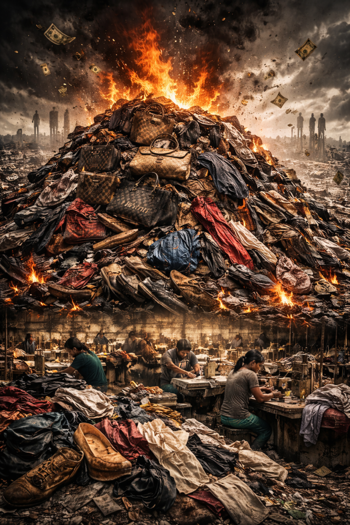 Focus: Overproduction, luxury waste (burning stock), environmental harm, exploitation of minority communities